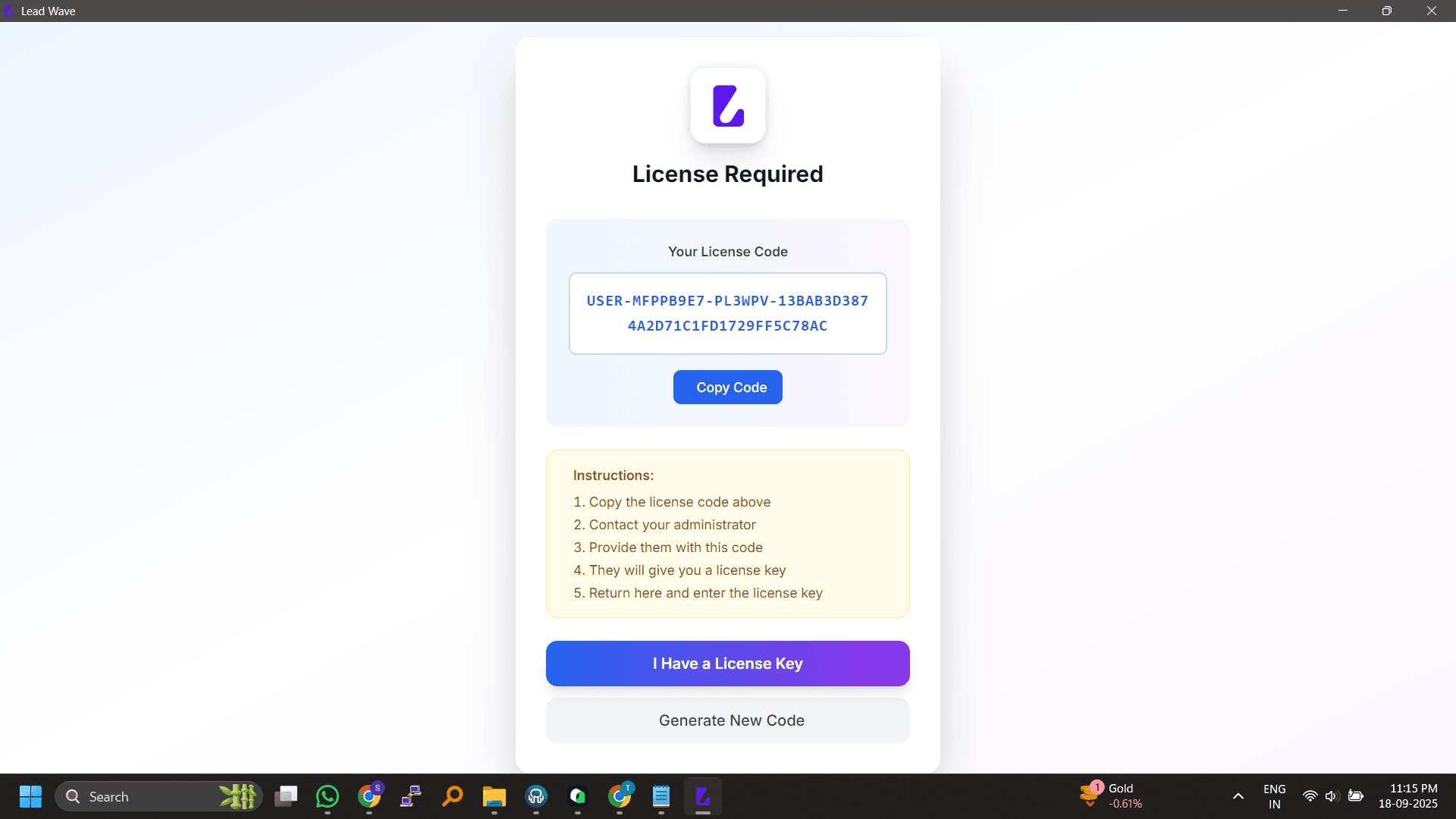 بعد التثبيت، سيعرض التطبيق رمز ترخيص فريد. انسخ هذا الرمز كما هو موضح في لقطة الشاشة الأولى أدناه.